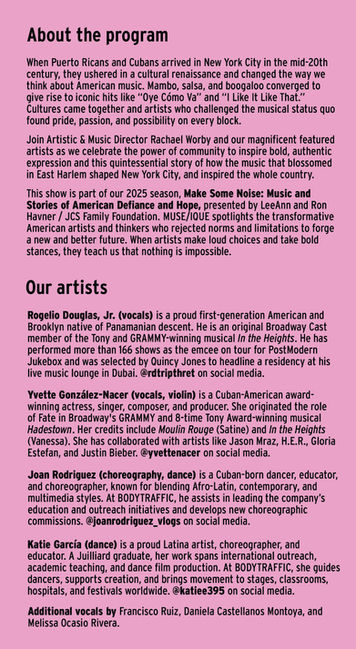 Join Artistic & Music Director Rachael Worby and our magnificent featured artists as we celebrate the power of community to inspire bold, authentic expression and this quintessential story of how the music that blossomed in East Harlem shaped New York City, and inspired the whole country.